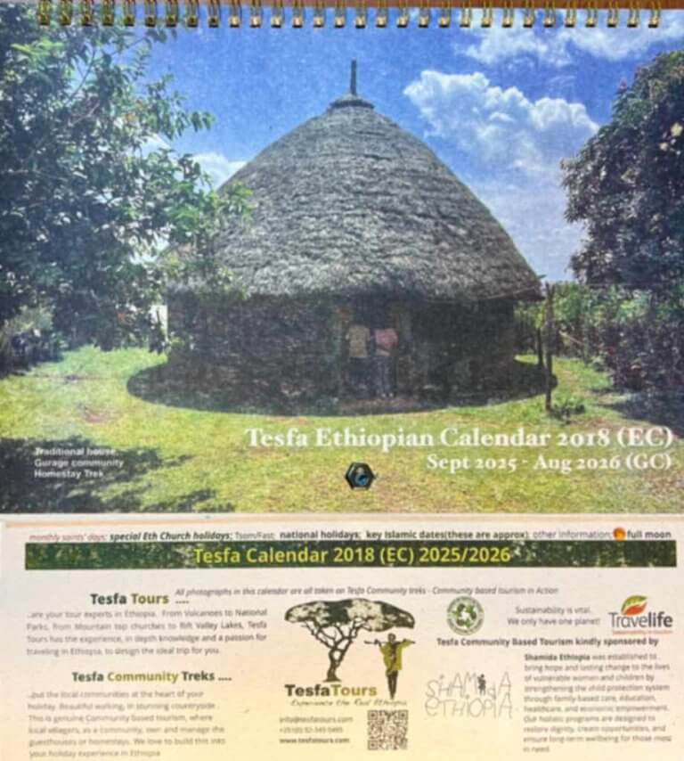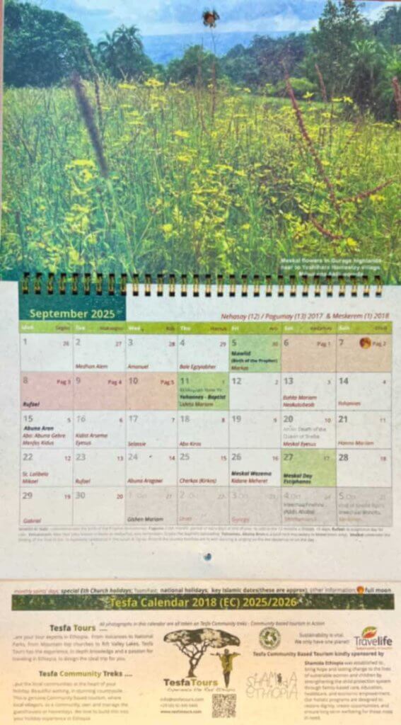 To explore and understand the full splendour of the Ethiopian Calendar contact us to get the wall hanging calendar or diary version of this epic calendar (see images here). You will see the monthly recurring saints days, annual celebrations, special holidays, fasting times; all carefully interwoven with Islamic holidays (that have a lunar element of unpredictability) and national days. As this is all displayed with western and Ethiopian dates clearly marked, it is an essential tool for living here and understanding much of what is going on.