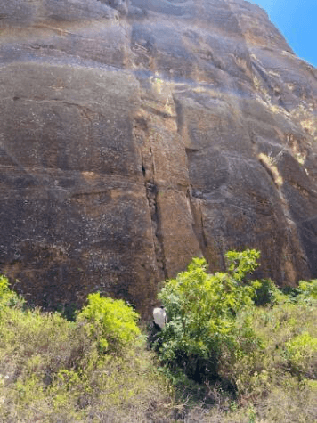 A book was discovered at the nearby Teklehaimanot church, that tells of the existence of this church and where to find it. Through a crack in the rock the corner of shaped stones can be seen, but only just. To the left of this was a strange stack of cut rocks filling recess in the cliff. These had the same weathered face but smooth sides and deeper into the recess were also smooth sides so it seemed as if these rocks had been put back in but further out than their original position. It is a mystery how anyone would have cut this rock surface unless they had a saw that goes through rock! We speculated that there has to be a way in from above. It appears that there was a way to climb up to a platform but it’s difficult to see anything from way below. My suggestion was that Berhe (who is a great climber) and a few others come up and climb up the rock face to see if there is any other possible entrance.
